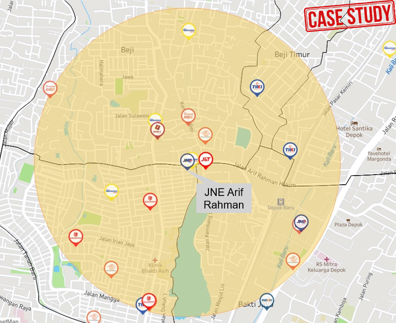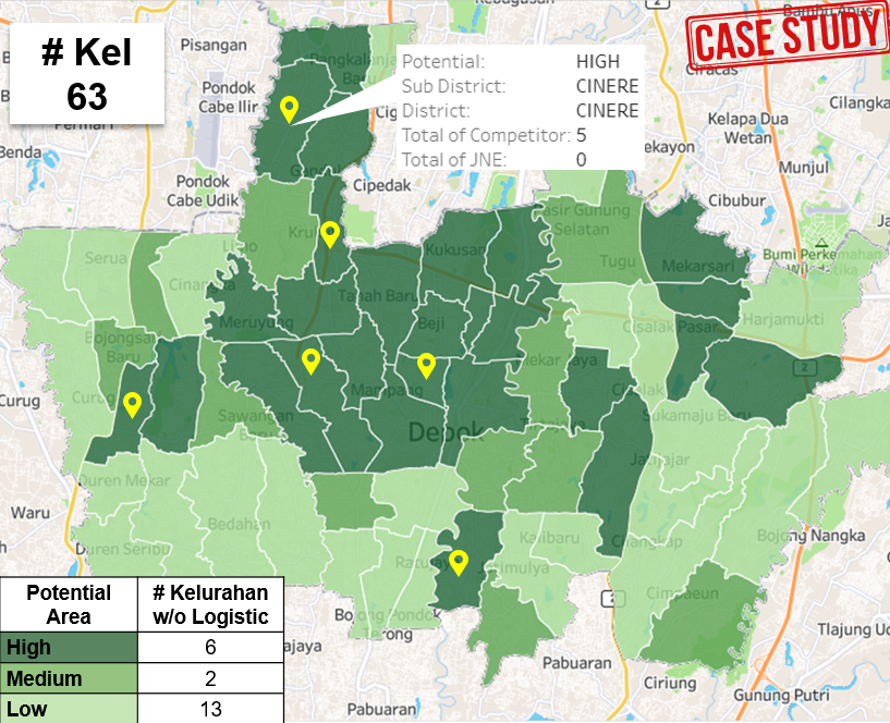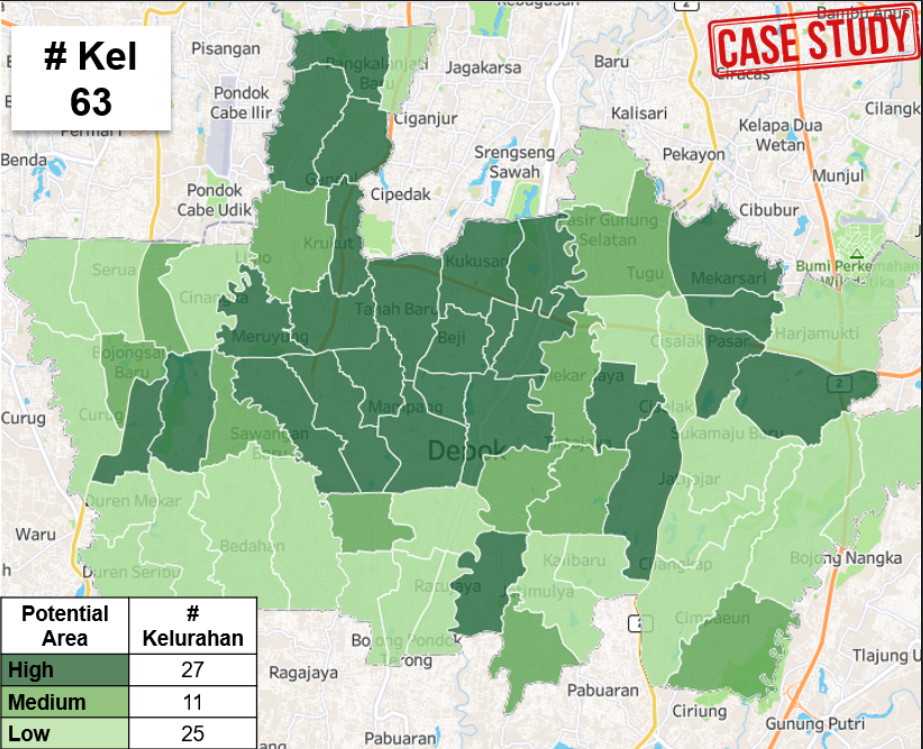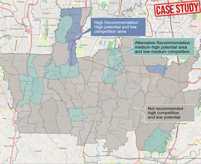 As illustration, Kelurahan Beji has high potential area with low number of competitor.