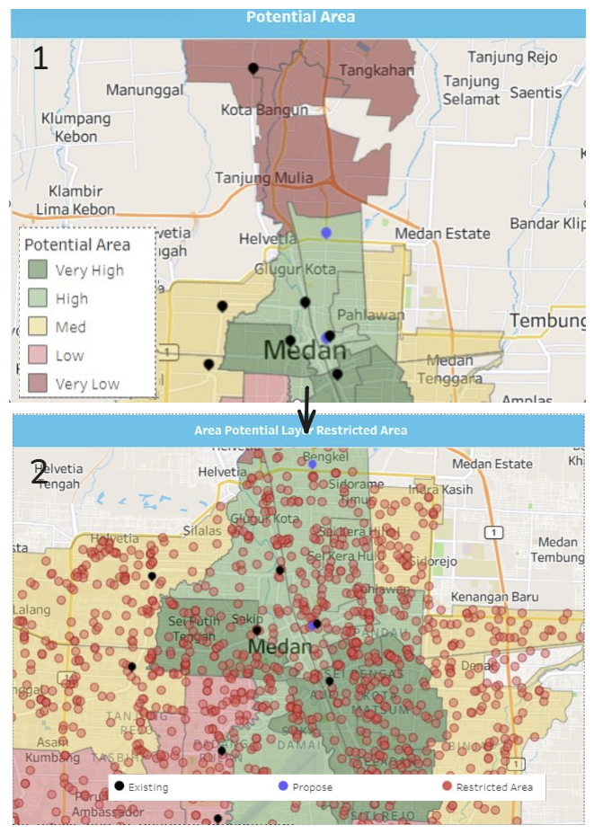 Set up criteria easily, see in beautiful presentation, and decide campaign strategy within less time consuming. #1 showing potential area for cigarette campaign #2 layered potential area with avoid place, thus the campaign remains optimum and complies with regulations